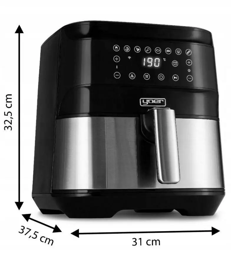 | 4в1 фритюрниця, духовка, гриль, сушарка | Потужність 1700Вт | 12 год - таймер | 10 програм | Решітка для гриля | Чаша сепаратор | Чаша 6л | Сенсорна панель | Діапазон температур 80 - 204°C | Час роботи до 60 хв | WiFi | Конвекція | Рецепти в додатку Yoer | Сертифікат CE |