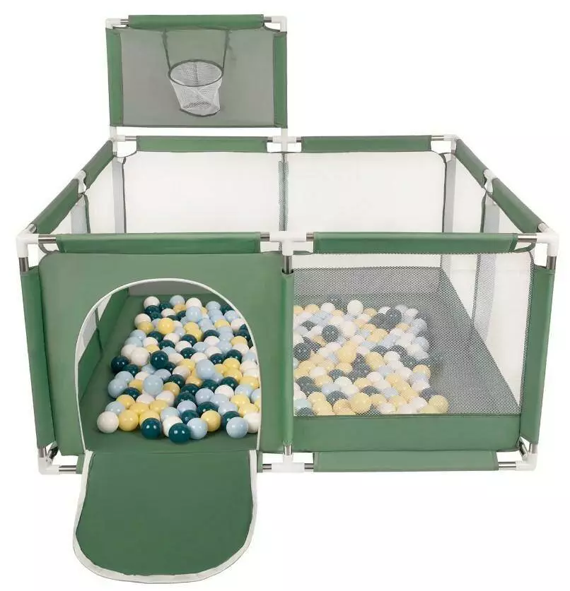 ⭐ Розкладний манеж з пластиковими кульками у формі міні-майданчика подарує вашій дитині години розваг. Всередині достатньо місця для вільної гри кількох дітей. При цьому манеж легко складається, тому його можна сховати або взяти з собою у відпустку, на пікнік або в гості до друзів. Одна зі стін оснащена сітчастим баскетбольним кільцем, що дозволяє маленьким дітям змагатися в командній грі.