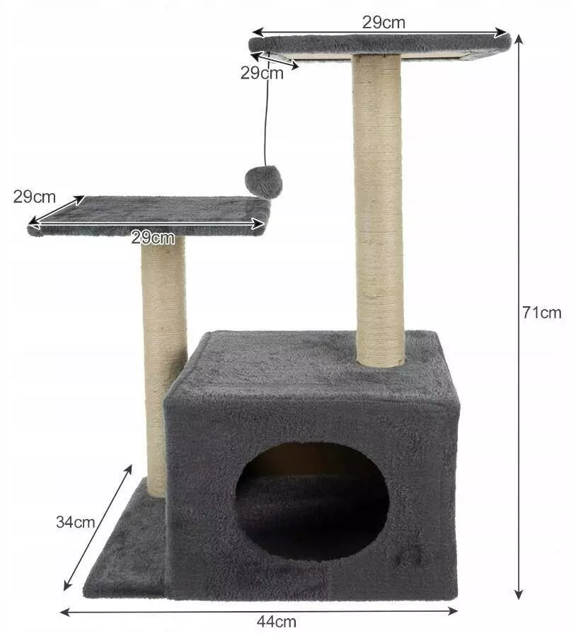 СПЕЦИФІКАЦІЯ - колір: сірий / бежевий; матеріал: плита МДФ + в'язане штучне хутро + паперова трубка + сизалева мотузка; розміри: платформа: 29 см; розміри: 71 х 44 х 34 см; вага 5,5 кг; вага в упаковці: 6,10 кг.