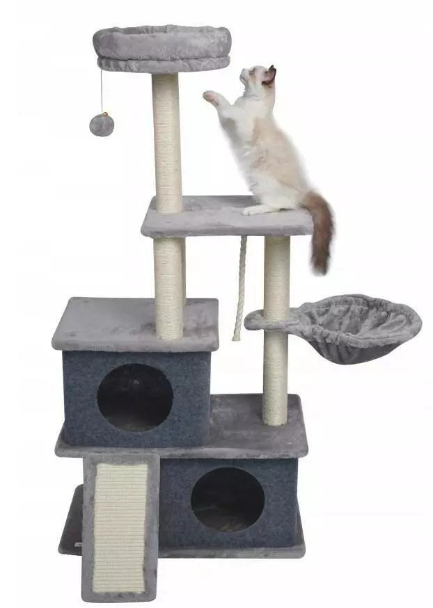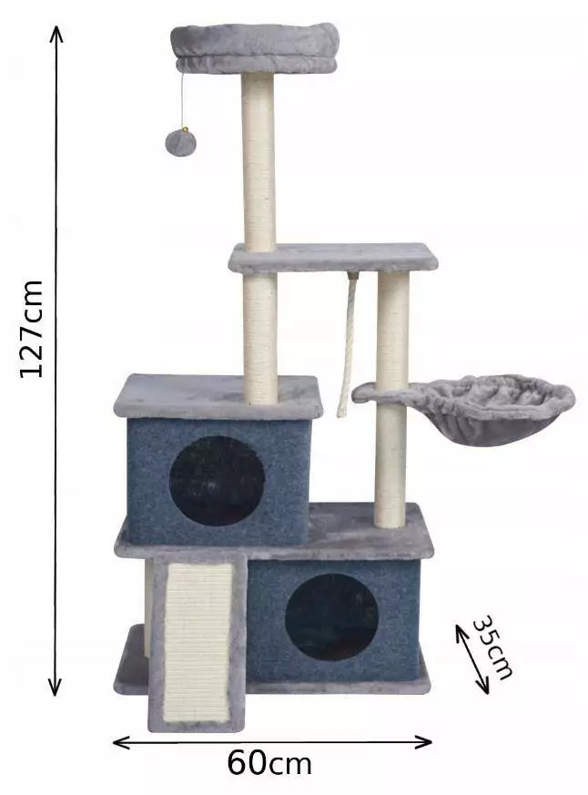 кігтеточка у формі дерева має висоту 118 см, вона розділена на 5 поверхів, якими кішка може вільно пересуватися й відпочивати, а також ховатися й гратися з іншими кішками. Міцна конструкція із широкою основою забезпечує стійкість кігтеточки. Головна перевага дряпки — затишний будиночок, завдяки якому кошеня зможе безперешкодно відпочити.