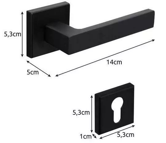 ТЕХНІЧНІ ХАРАКТЕРИСТИКИ - колір: чорний матовий; матеріал: залізо + алюміній; для дверей: міжкімнатні; розмір ручки: 5,3 х 5 х 14 см; розміри розетки: 5,3 х 5,3 х 1 см; вага: 440 г; вага в упаковці: 486 г.