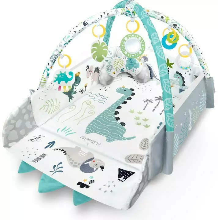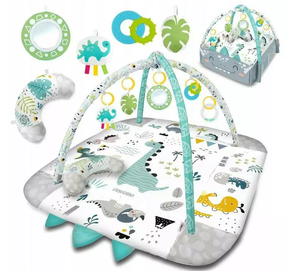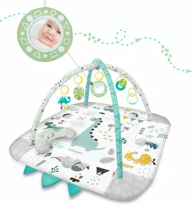 Тому ми додали в килимок багатофункціональні іграшки, які можна вішати на ручки - брязкання або шурхіт привертають увагу і цікавість дитини. Також є скрипуча іграшка - динозавр із стрічками, які стимулюють дотик!