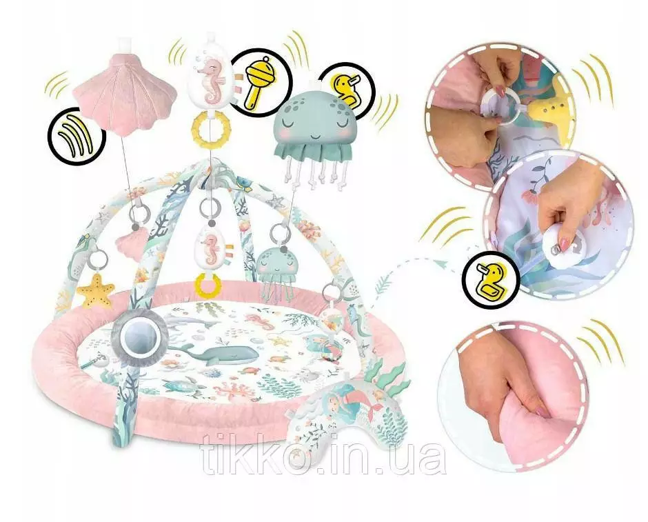 Тому на килимок ми прикріплюємо багатофункціональні іграшки , які можна повісити на решітки - нехай щось гримить, дзвенить, шелестить! Серед іграшок є навіть писклява іграшка – краб!