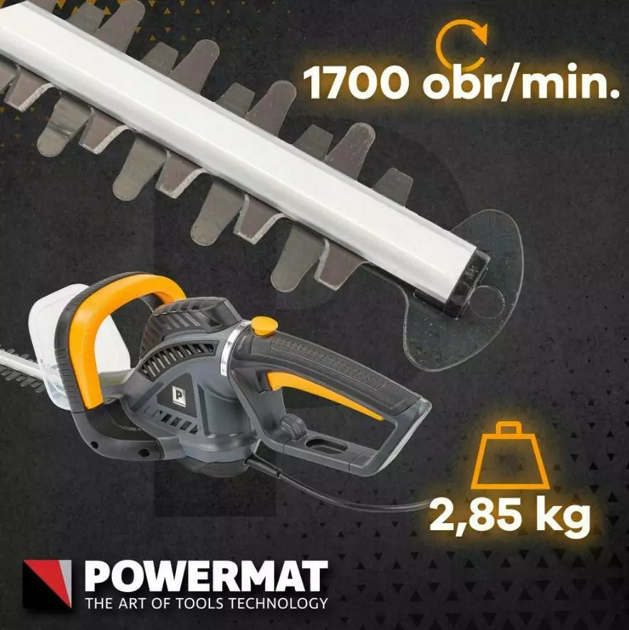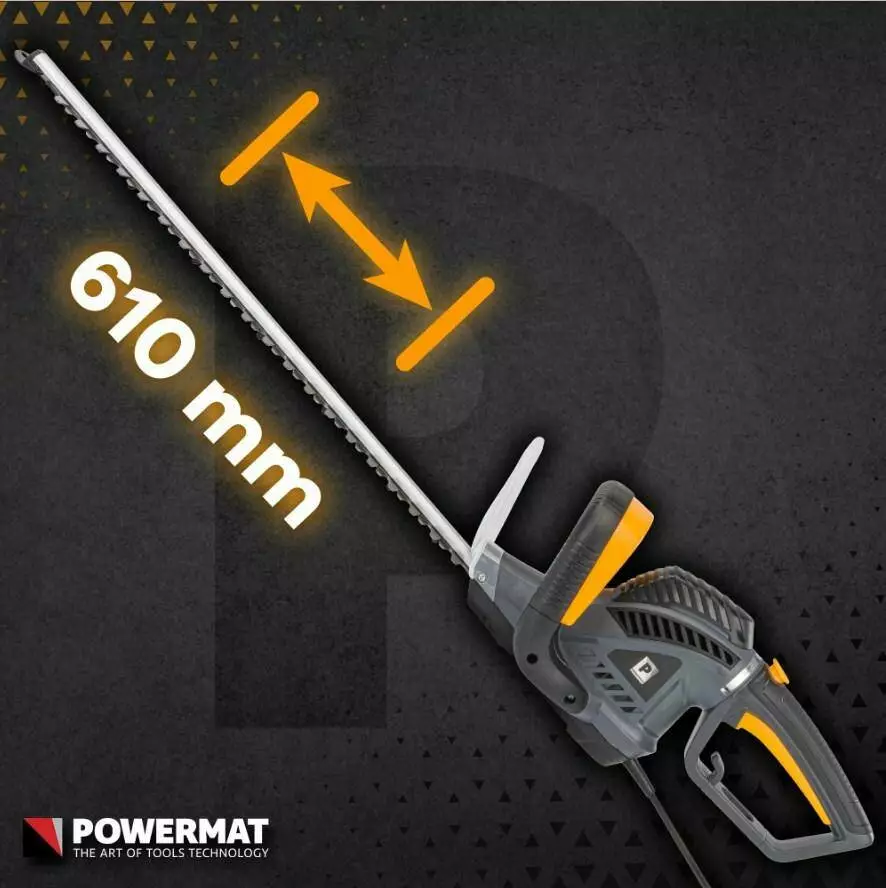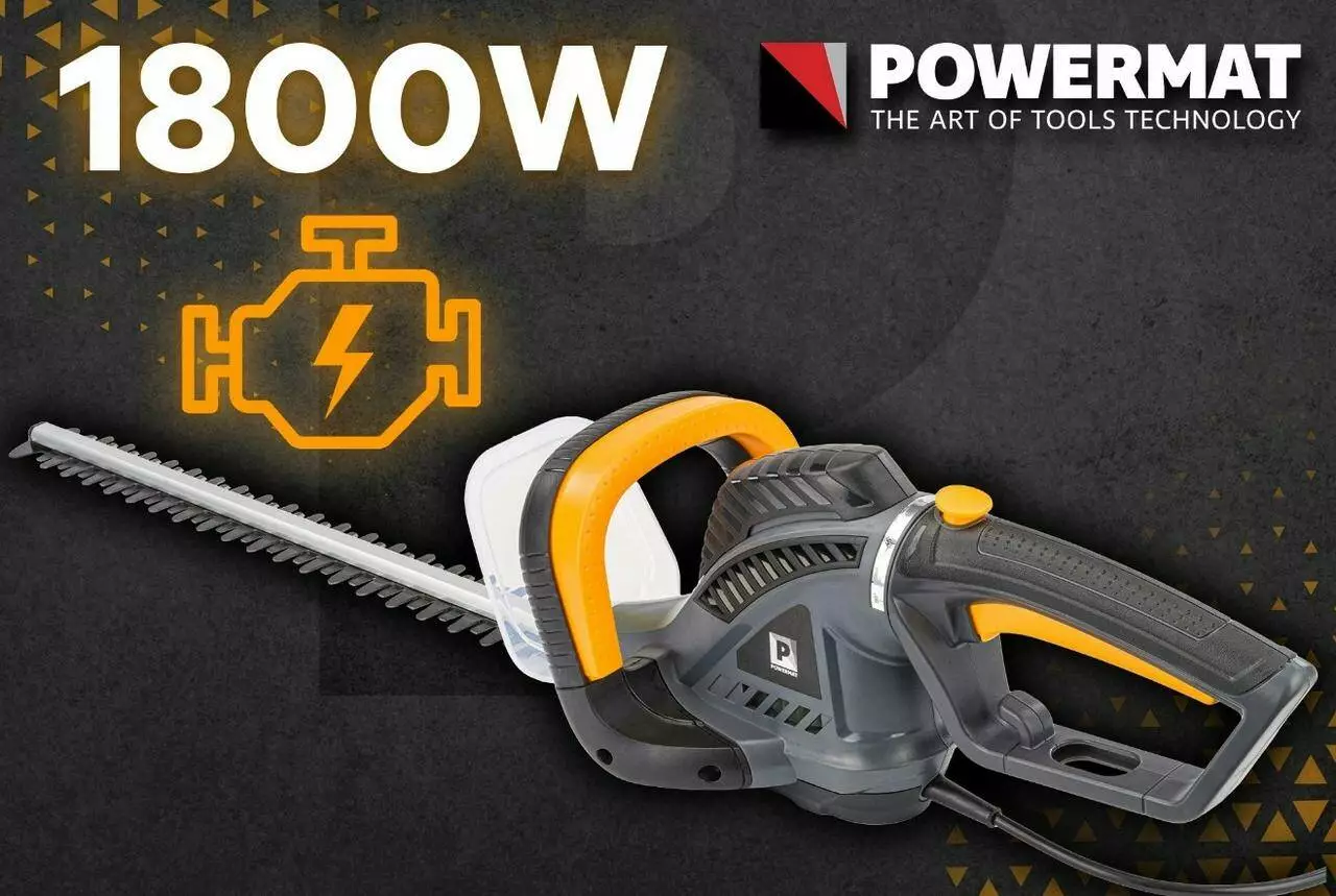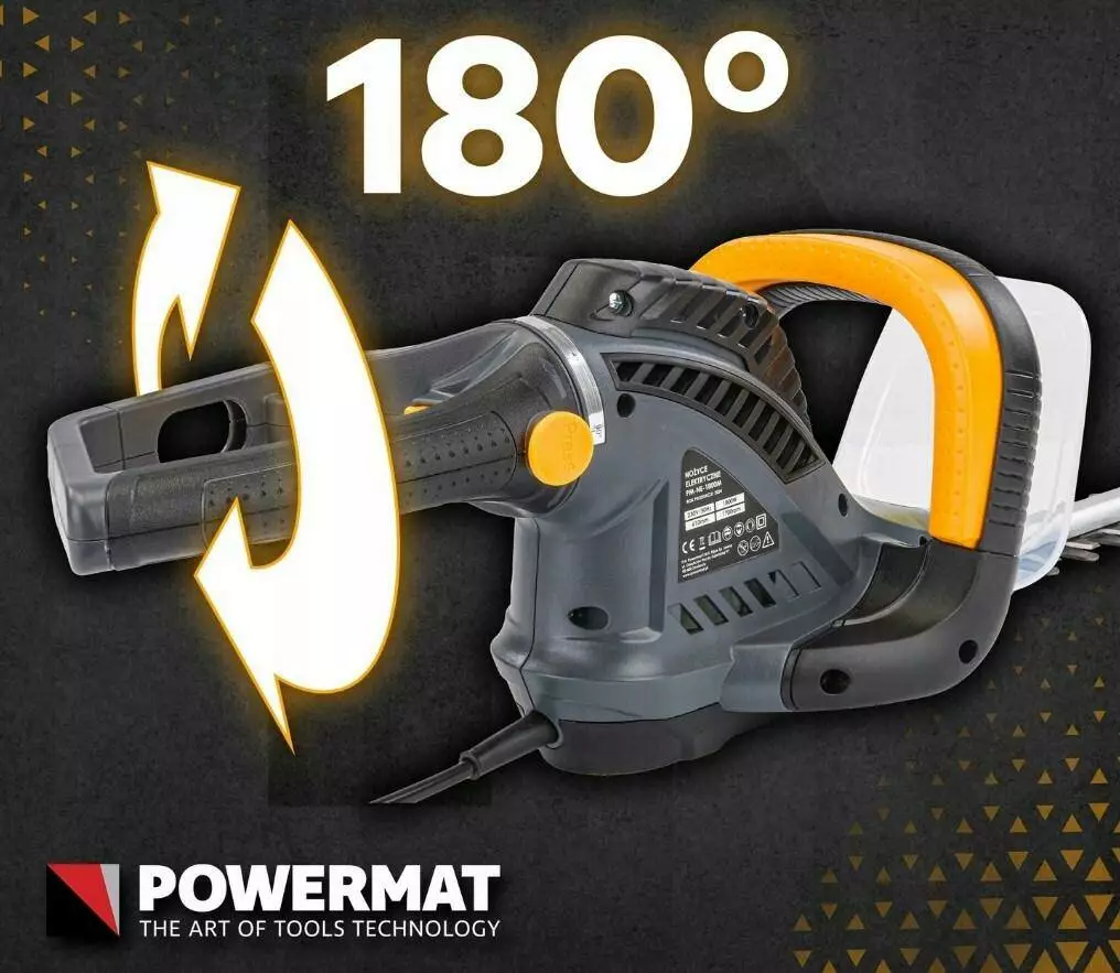 Електричні ножиці POWERMAT PM-NE-1800M з високоякісним лезом з високовуглецевої сталі. Можливість швидкого і легкого регулювання кута нахилу ручки ножиць до 5 градусів значно полегшує обрізку кущів. Ефективний електродвигун потужністю 1800 Вт дозволяє зрізати товсті гілки з максимальною шириною зрізу приблизно 20 мм