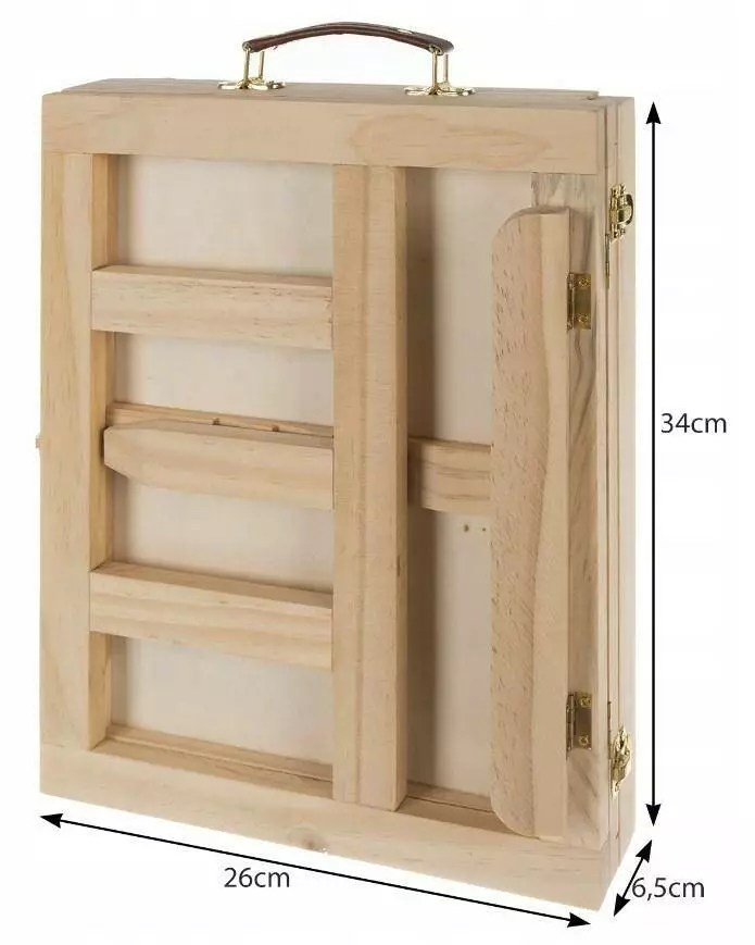 ЛЕГКА ТА ПРАКТИЧНА ВАЛІЗА 2 В 1 – мольберт складається у валізу. Валіза має міцну зручну ручку, що робить транспортування простим і комфортним. У ньому є ящик для аксесуарів , який закривається на міцні металеві пряжки, щоб валіза була щільно закрита і нічого не випало або не загубилося.
