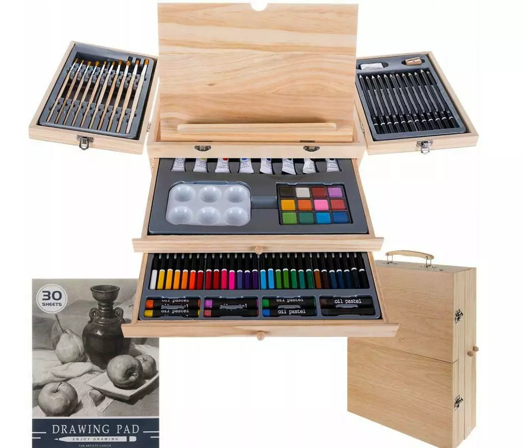 83 ЕЛЕМЕНТИ - набір для малювання у валізі містить багато елементів, серед яких: валіза з мольбертом, альбом для малювання, 10 пензлів, 12 олівців різної м'якості (2xH, 2 HB, 2xB, 2x2B, 2x4B, 2x6B), ластик. , точилка, 8 акрилових фарб, палітра, 12 акварельних фарб, 28 кольорових олівців, 8 олійних пастелей.