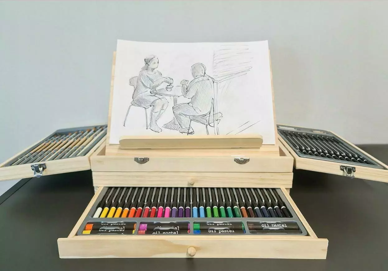 Всі елементи набору для малювання знаходяться в спеціальній дерев'яній валізі. У комплект валізи також входить мольберт з 3-ступінчастим регулюванням. Завдяки цьому передавати контент дуже просто і зручно. Ми можемо легко взяти набір із собою, наприклад, на вулицю.