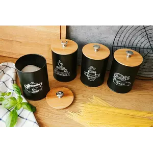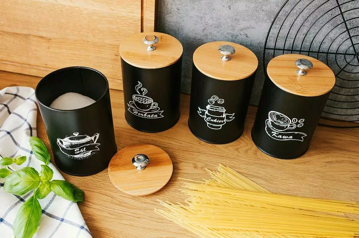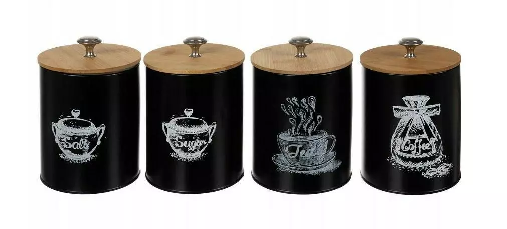 СТИЛЬНИЙ І СУЧАСНИЙ ДИЗАЙН - набір з 4 чорних харчових контейнерів - ідеальне поєднання сучасного стилю та функціональності . Кожен контейнер має елегантний мінімалістичний вигляд , який ідеально вписується в сучасну кухню. Завдяки чорному покриттю і витонченим сріблястим ручкам з нержавіючої сталі ємності стануть як практичним елементом кухонного обладнання, так і стильною прикрасою . Їх естетику підкреслює елегантна біла графіка з призначенням контейнера: кава, чай, цукор і сіль. Завдяки цьому цей набір стане яскравим доповненням на кухонній стільниці .