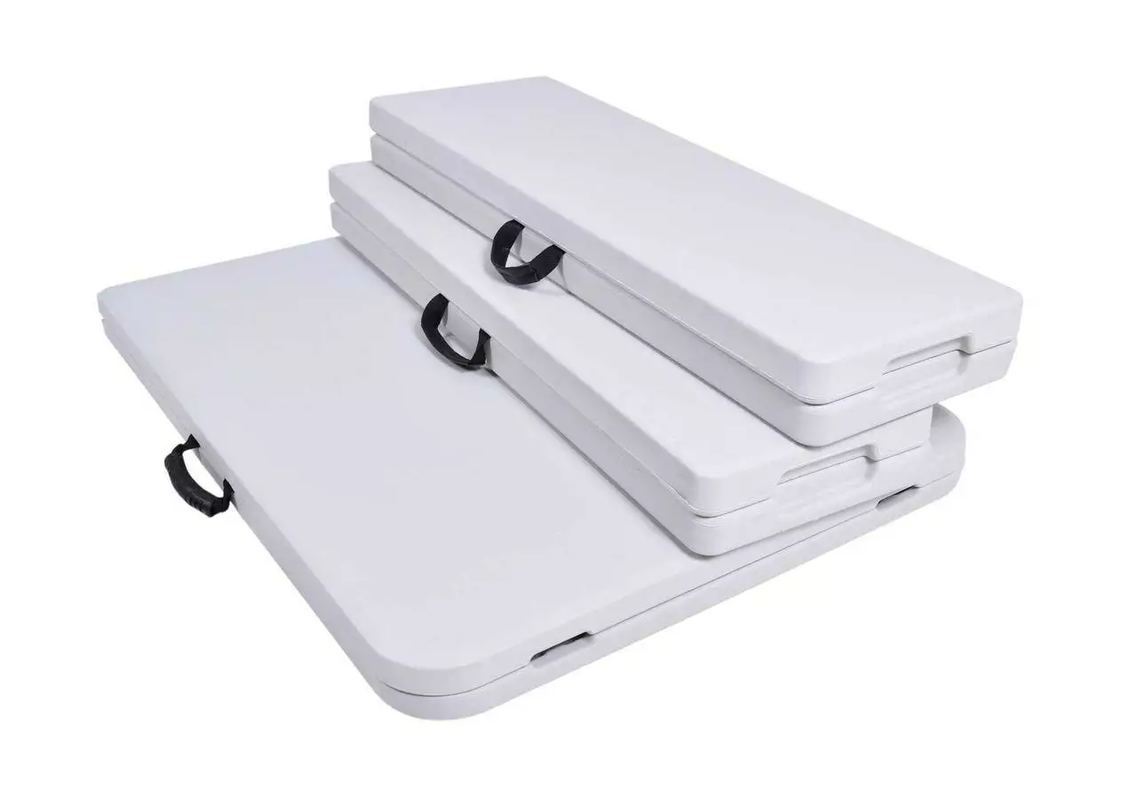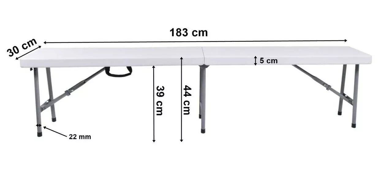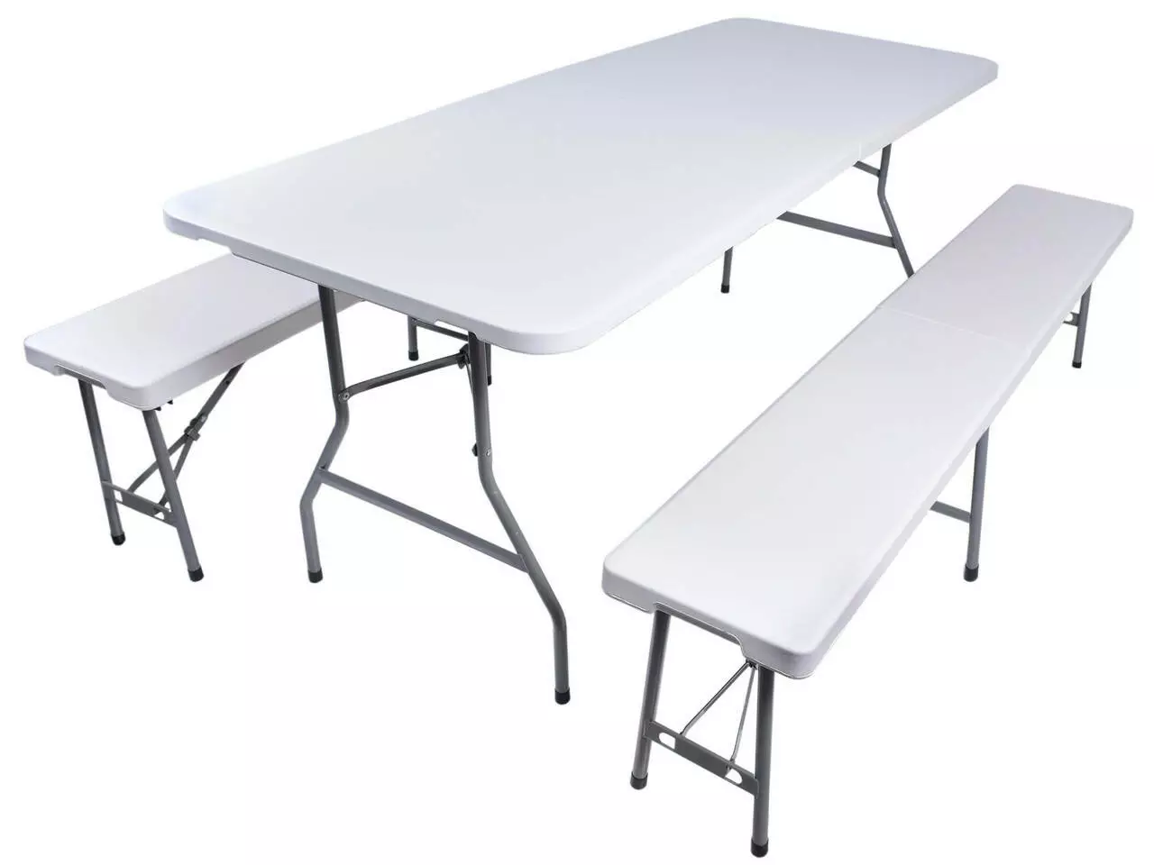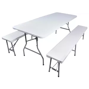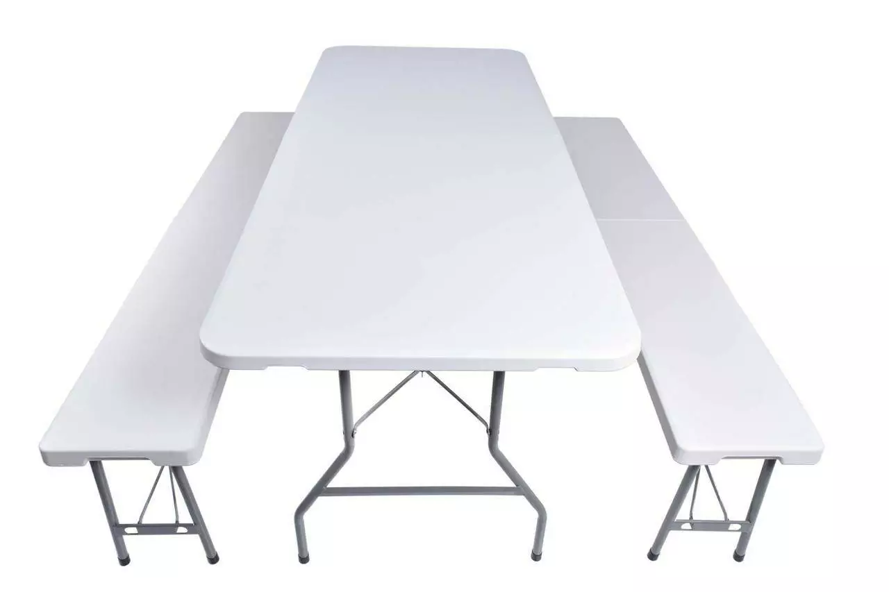 Складаний набір для громадського харчування. Дуже практичний і легкий . Конструкція виконана з сталі з порошковим покриттям . Столешница и сидения из прочного пластика HDPE . Стол и скамейки имеют специальные складные замки , благодаря которым они стабильны при разворачивании. Набор устойчив к погодным условиям и УФ-лучам . Стол и скамейки после складывания делают практичные чемоданы, благодаря которым они занимают мало места и легко транспортируются. Встроенные ручки облегчают перенос. Ножки стола и скамейки имеют нескользящие ножки, которые обеспечивают стабильность.