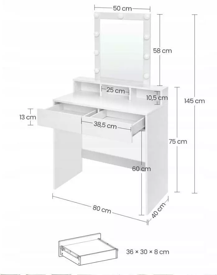 Розміри туалетного столика: 80 х 40 х 145 см (ширина х глибина х висота)